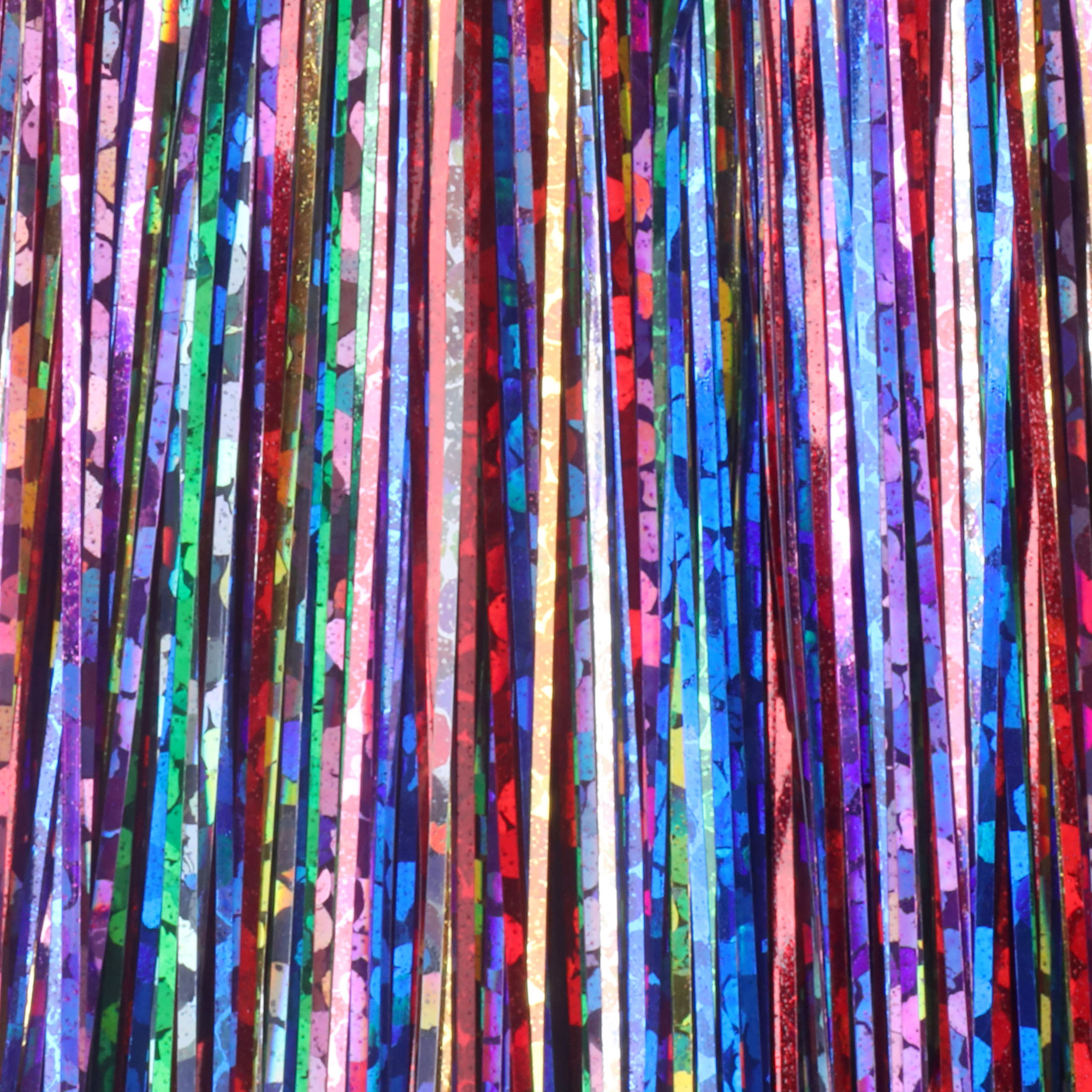Each pack contains thin strands measuring approximately 0.03 mm thick, 0.33 mm wide, and 47 cm long. Made from water-resistant synthetic film. The strands feature either a holographic or iridescent finish, producing vivid, shimmering reflections that can attract fish even in low-light conditions.