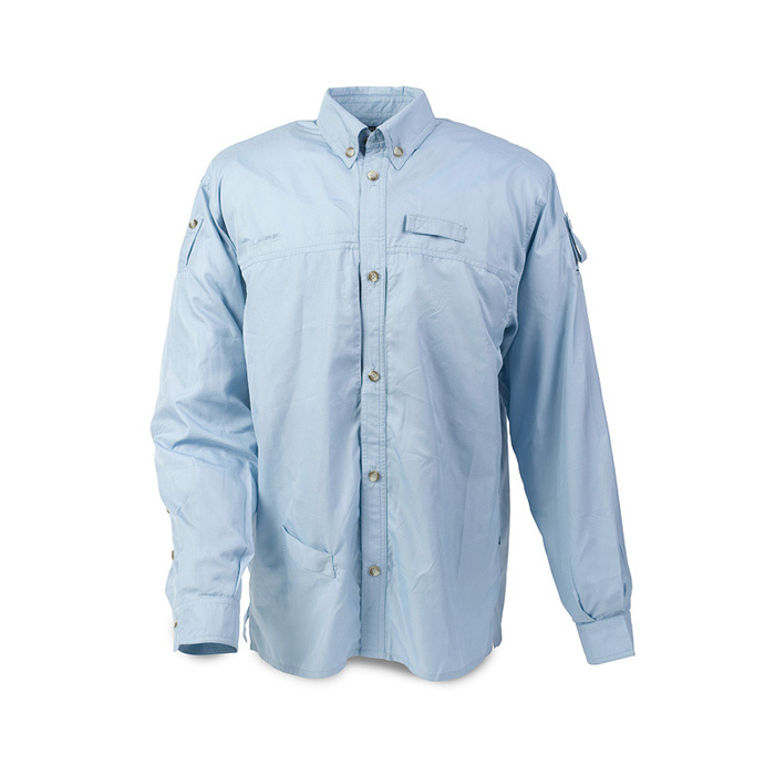 100% lightweight nylon, quick dry function and UV-protection. 2 large velcro chest pockets. 2 tippet pockets. Hidden retractor. Velcro rod holder on the front and Velcro straps on the back. Button down collar. Roll-up sleeves. Fold-up collar for sun protection of the neck. Ventilated mesh panel under arms and centre back yoke. Comes with a dry pouch bag. Colour: Light Blue.Do you need help? Do you have any questions?Ask a question and we'll respond promptly, publishing the most interesting questions and answers for others.