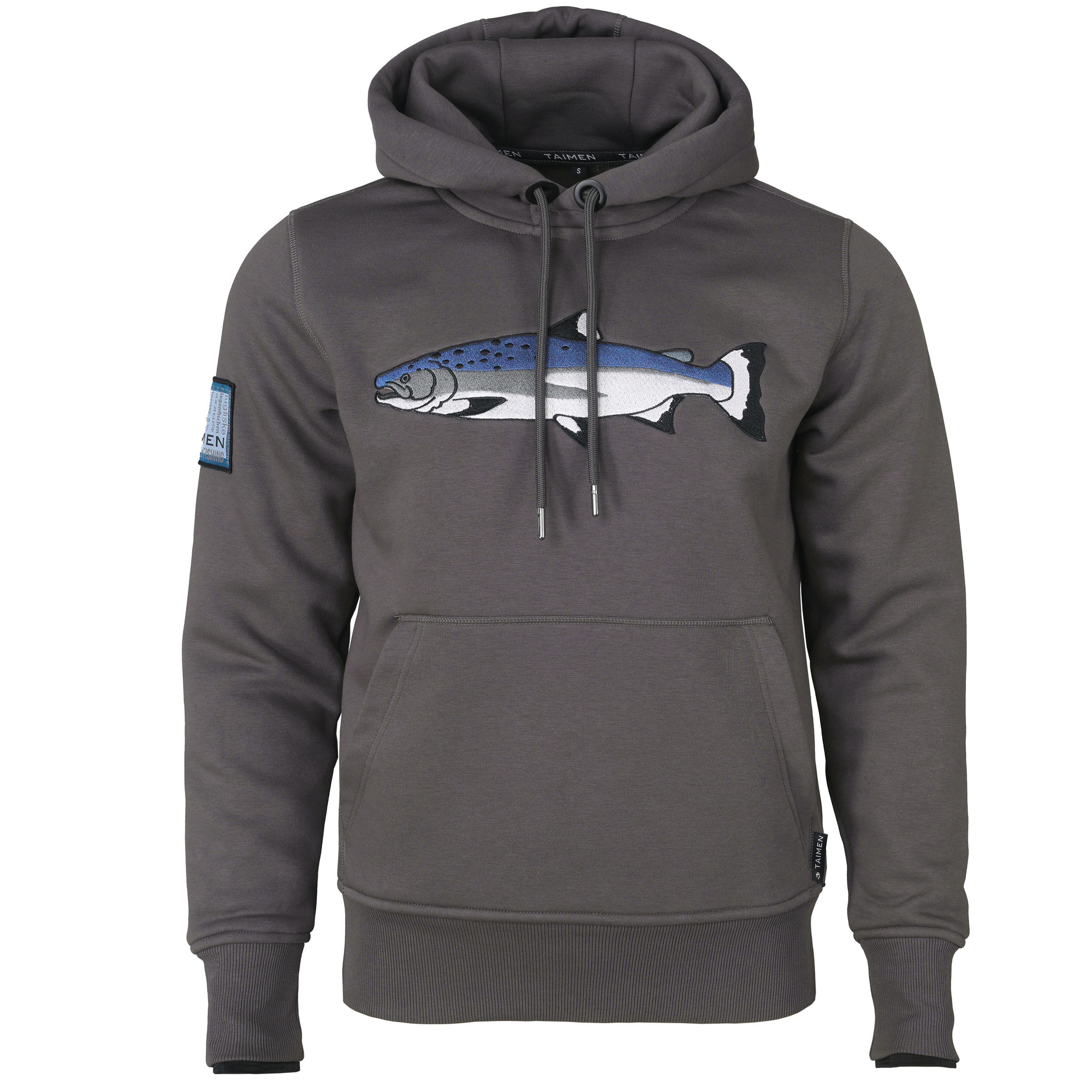 Selle kalapüügi kampsuni neutraalne hall varjund lisab rafineeritust ja mitmekülgsust. See sobib suurepäraselt lõhe tikandiga, luues stiilse ja funktsionaalse eseme igasse garderoobi.