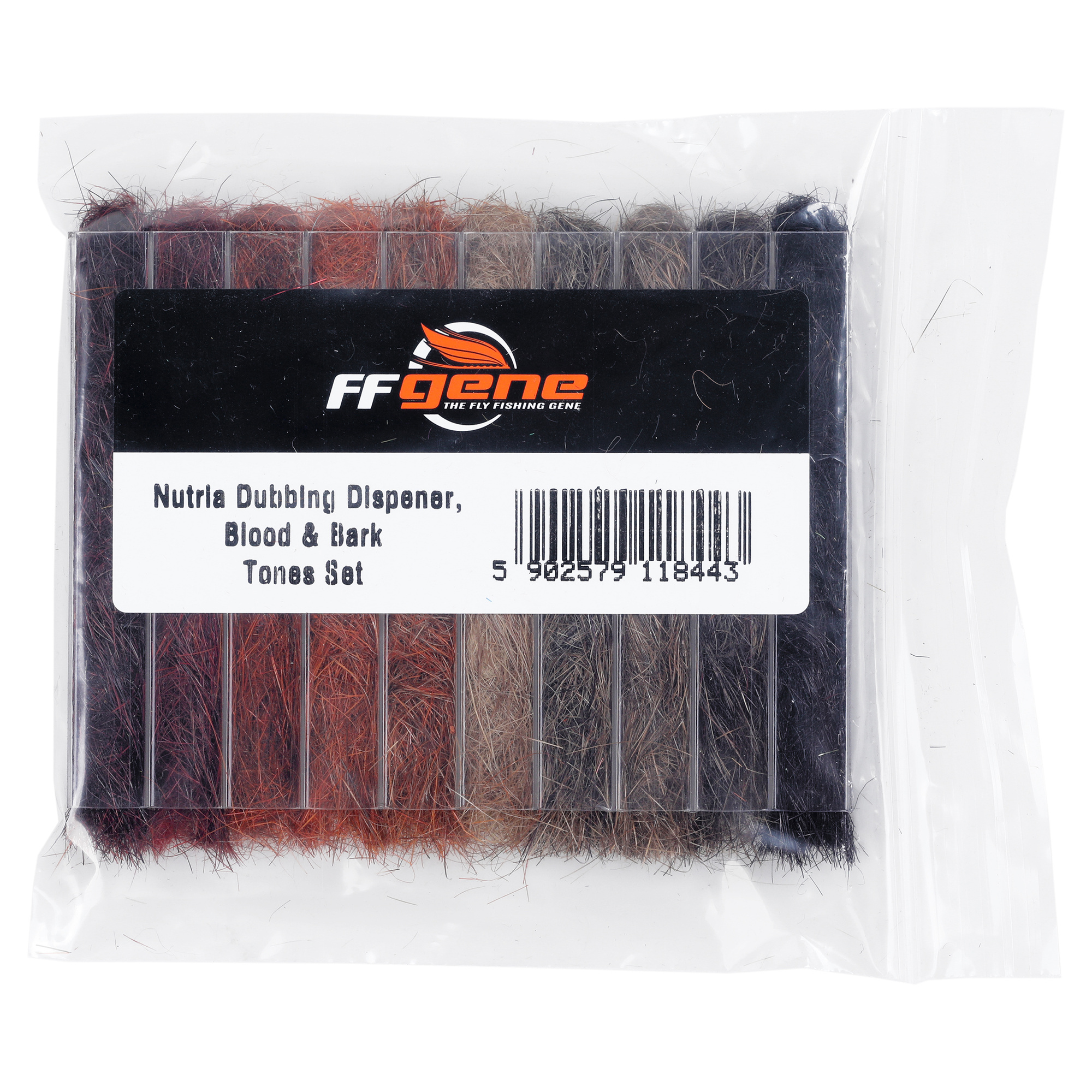 FFGene Nutria Dubbing Dispenser är en uppsättning naturlig dubbning gjord av nutriapäls, prydligt organiserad i en transparent plastdispenser.